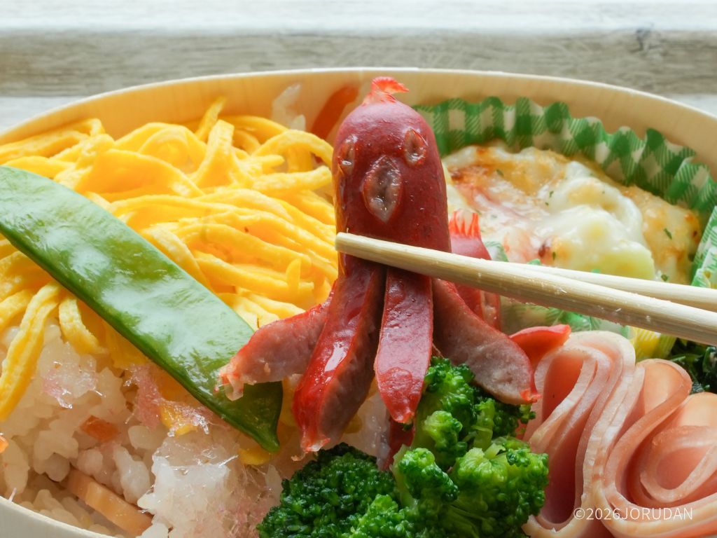 春の彩りちらし弁当 (980円):錦糸卵や桜でんぶで春らしく彩られたちらし寿司に、エビグラタンやタコさんウインナーなど、大人も子供も大好きな親しみのあるおかずが添えられています。