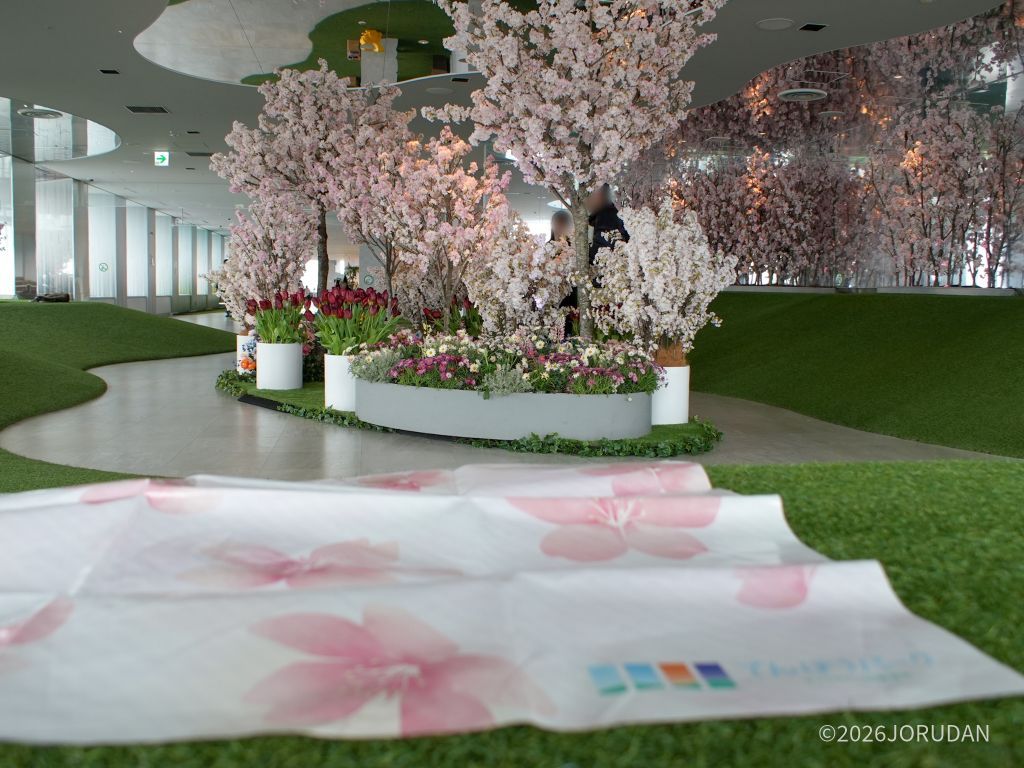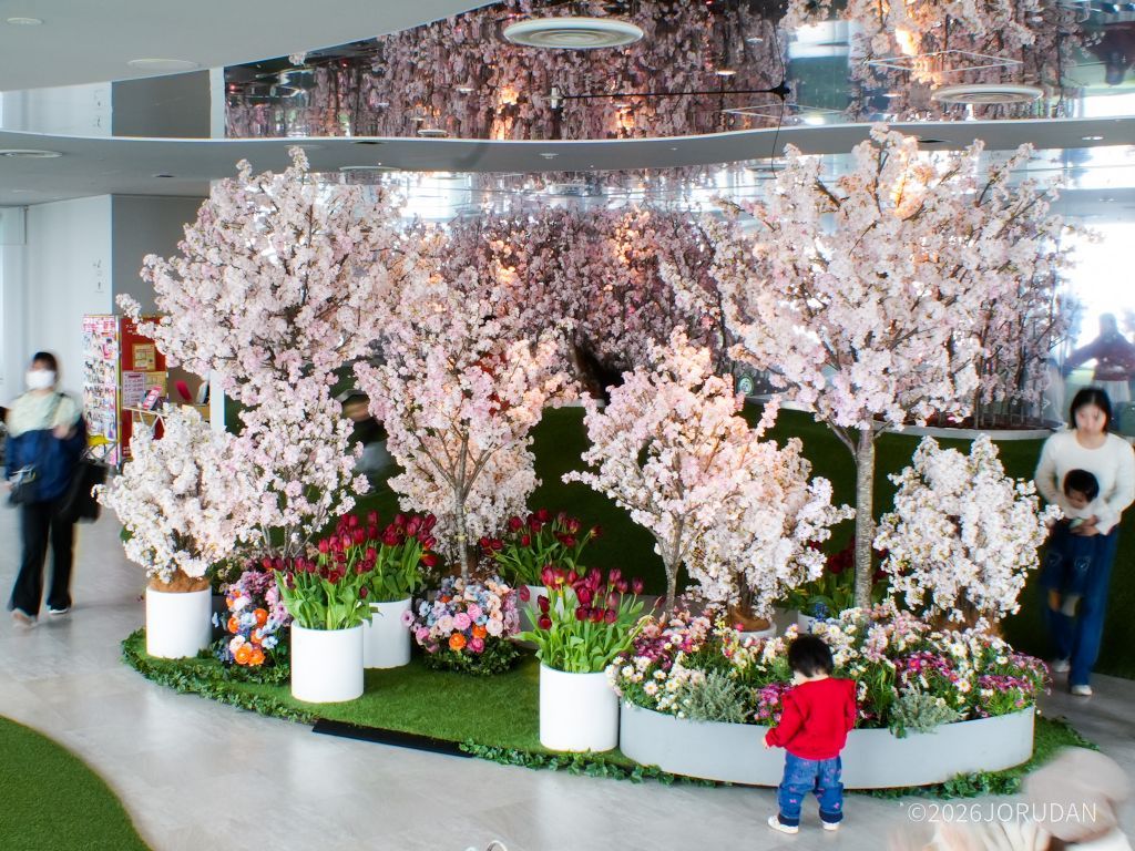 今年の装飾のテーマは「さくら」と「カラフルなお花」。サンシャイン60がある豊島区はソメイヨシノ発祥の地とされており、装飾の一部に本物の「ソメイヨシノ」の枝や幹が使用されているそうです。メインのフォトスポットには桜のほかに、チューリップやマーガレットローリー、ノボリフジなど色鮮やかな花々が咲き誇り、より春らしい華やかな空間を演出しています。