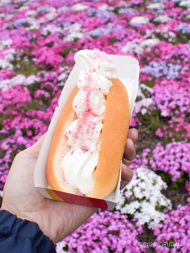 桜チュロスは「桜」の文字をかたどった見た目にも可愛らしい一品です。カリッとしたザクザク食感と、噛むと広がるジューシーな味わいが特徴で、食べ応えがありながらも重すぎない絶妙なバランスに仕上がっています。満開の芝桜や富士山を背景に掲げて撮影すれば、SNS映えする華やかな写真が残せます。