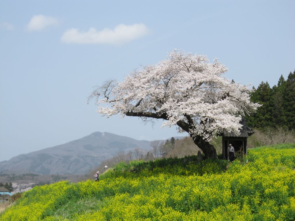 傍らに子安観音を祀った祠があります。畑の中に一本だけ咲く桜は風情たっぷりの景色となっています。