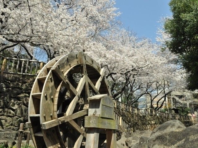 石神井川の旧流路に整備され、「日本の都市公園100選」の一つに選ばれた公園。音無橋の下流にかけて水車や東屋、行灯が配され、ところどころに江戸の風情が感じられる。行灯型の照明と音無橋に桜が見事にマッチして雰囲気たっぷり。