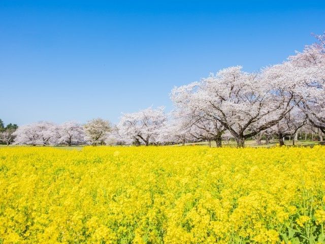 東京ドームの39倍という広さがなんといっても魅力!みんなの原っぱの北側にある「桜の園」では青空の下、ゆったりとお花見ができる。園内の約1500本、約30品種の桜はどれも見事。中でも緑色の花をつける珍しいウコンやギョイコウの見頃は4月中旬となる。3月下旬から5月下旬にかけて、桜をはじめ、菜の花やチューリップ、シャーレーポピーなどが楽しめる「フラワーフェスティバル」を開催予定。期間中は春限定グルメが登場。園内にはバーベキュー施設やレンタサイクル、親子で楽しめるイベントも多く、1日たっぷり遊べる。