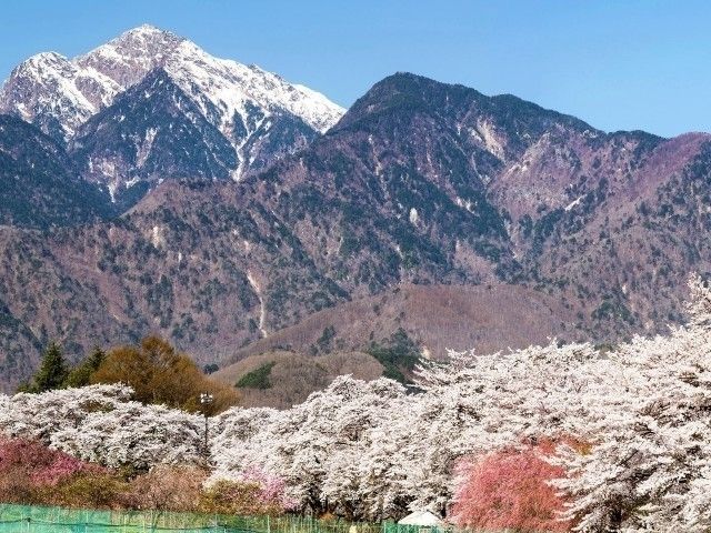 北杜市武川(むかわ)町の眞原(さねはら)地区に広がる牧草地の道路脇に並ぶ約200本ものソメイヨシノの並木。750メートルにわたり桜のトンネルが伸びている。昭和20年代に入植してきた人達が土地の発展を願い、昭和40年代にソメイヨシノを植樹したのが始まり。満開時には甲斐駒ヶ岳など南アルプスの残雪を眺めながら、桜吹雪のなかをゆったりと散策することができ、近くには天然記念物の「山高の神代桜」も見られる。また近隣にはキジが生息し、運が良ければ国鳥に出会うことも。