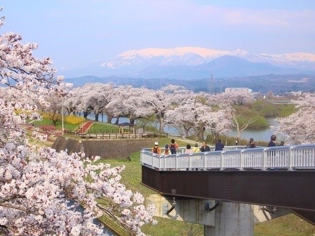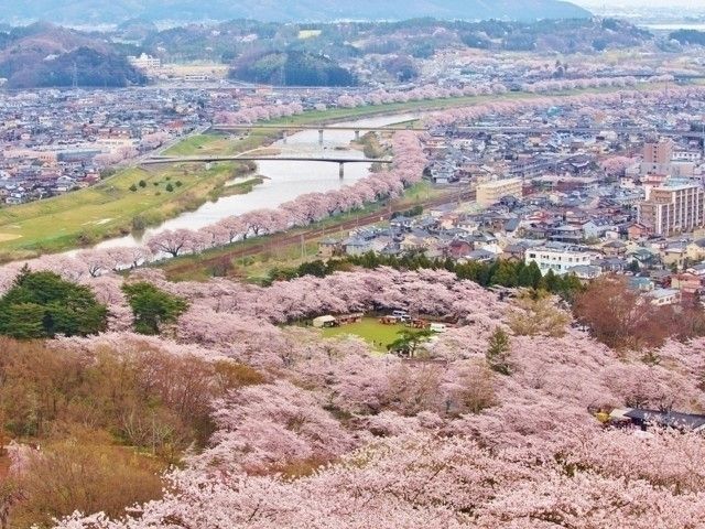 山のほとんどが桜です。南側にある広い駐車場から山を歩いて登るのがオススメです。途中、二の丸跡辺り、「樅の木」、千桜橋に至るコースのあちこちで桜を堪能できます。そこから東北本線を走る列車と残雪の蔵王と桜の組み合わせが最高です。