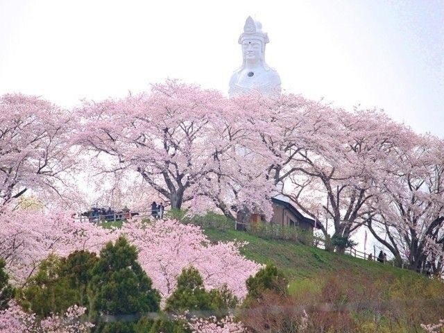 山頂の平和観音像がある場所の北側から山の斜面を望むと、一目千本桜や桜でいっぱいの山の斜面を楽しめます。