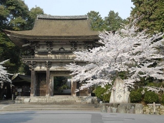 長等山の中腹に建ち、境内には約1000本の桜がある三井寺。4月上旬から中旬の見頃の時期には境内全域がソメイヨシノとヤマザクラで桜色に染まる。