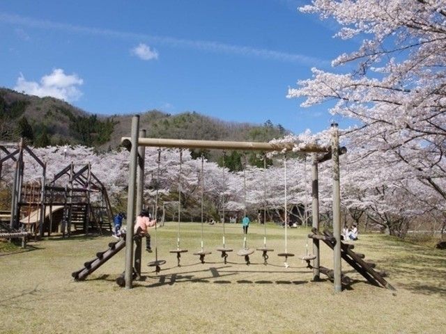 大野ダムの湖畔にあり、桜や新緑、紅葉そして雪景色と四季折々の美しい自然を楽しめる自然公園。園内には春になると桜の花が美しく咲き誇り、訪れる人の目を楽しませてくれる。無料のアスレチック遊具や芝生広場は家族連れでにぎわう。4月上旬から中旬にはさくら祭りが開催される。