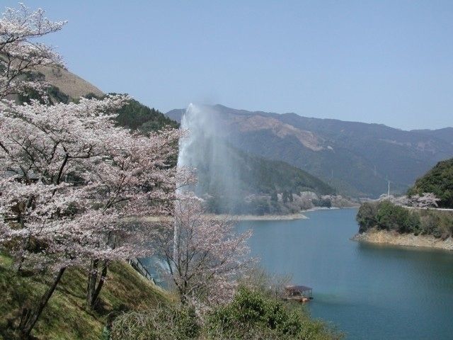 球磨川に造られたダムで、「一万本桜」と呼ばれる桜の名所。ダム湖の中央には、高さ約80mの水柱を上げる大噴水があり、500円で約10分間噴水のパフォーマンスが楽しめる。