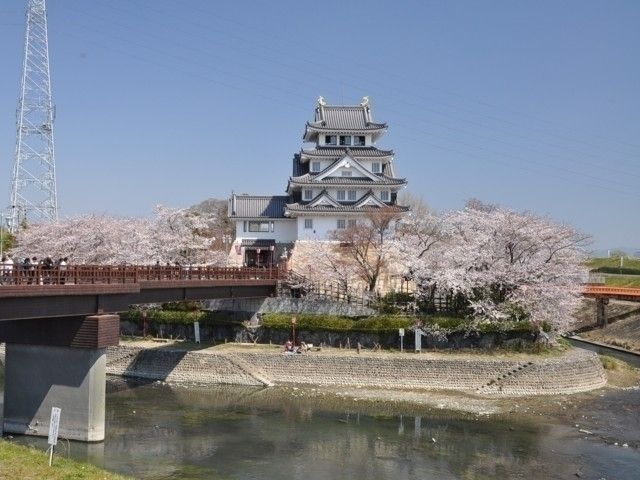 木下藤吉郎(後の豊臣秀吉)が、一夜にして築いたと伝えられる墨俣一夜城。その周りを流れる犀川の堤防には樹齢50年を超えるソメイヨシノ約750本の桜並木が約3.7kmにわたり続き、別名「桜堤防」ともいわれている。墨俣一夜城(大垣市墨俣歴史資料館)と桜の調和が見事だが、資料館の最上階から眺める景色もおすすめだ。また、ライトアップされた墨俣一夜城をバックにした夜桜も必見。
