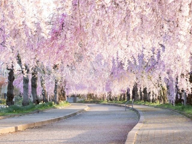 とにかくここのピンク色が濃いしだれ桜が最高に素敵です。ところどころのソメイヨシノ淡いピンク色も良いアクセントになり、日の落ちる空の青さとピンクのコントラストがまぁ素晴らしい。翌日の早朝も快晴に恵まれて桜の花びらがとても綺麗です。桜のトンネルでは、すべての方が立ち止まってシャッタータイム?!の大渋滞。端から端までしだれのピンクを満喫できました。