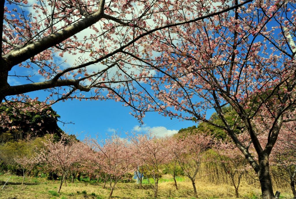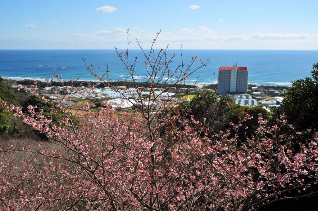 安房で初めて花作りに成功した間宮七郎平が植えた桜が、旧暦の元日の朝に咲くことから元朝桜と呼ばれるようになったといわれています。例年2月には「桜まつり」が開催され、少し濃いめのピンクが鮮やかな寒桜が咲き乱れるのを見ることができます。