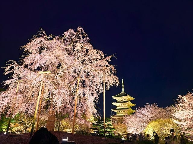 世界遺産に指定されている寺院・東寺。境内にはソメイヨシノや河津桜など、約200本の佐浦が咲き誇る、京都の桜の名所です。中でも「不二桜」と呼ばれる八重紅枝垂れ桜は圧巻。桜の季節の春期特別公開では、東北盛岡からきた不二桜に、東北への祈りを込めた夜桜ライトアップが行われます。