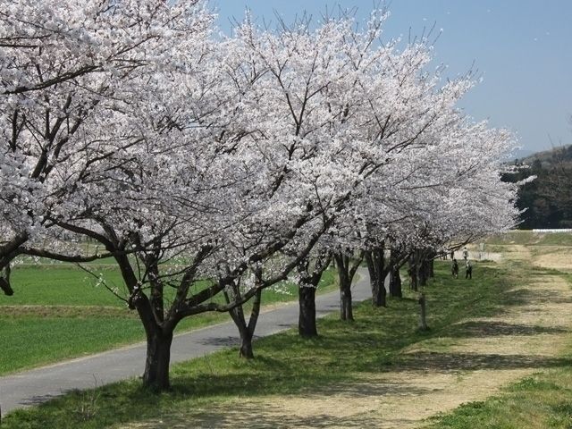 嵐山渓谷で有名な槻川の下流、都幾川右岸の八幡橋から二瀬橋、学校橋までの全長およそ2kmに、約250本のソメイヨシノが弓なりの堤に連なる。遠くまで桜並木が続いている様子は壮観。学校橋付近では菜の花と桜のコラボレーションが楽しめる。