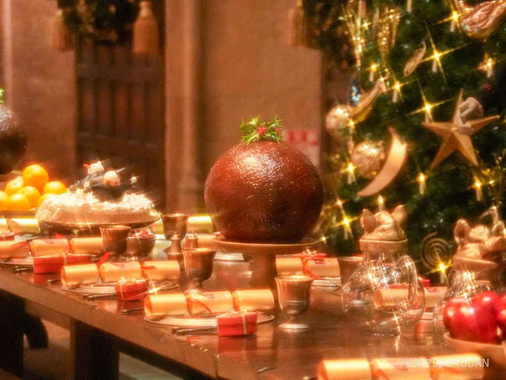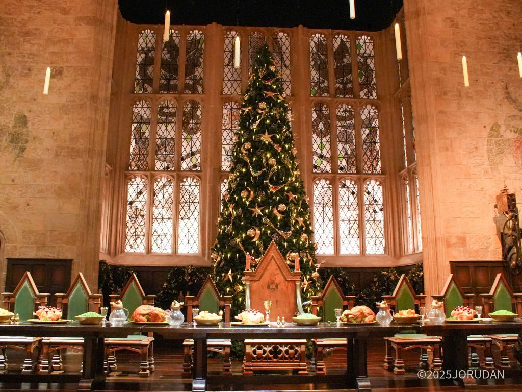 ツアーのハイライトである「ホグワーツ大広間」がクリスマスの装いに一変。大広間には色とりどりのオーナメントやリボンが飾られたクリスマスツリーが立ち並び、ガーランドや大きなリースが空間を彩ります。大テーブルには、七面鳥やケーキ、クリスマスプディングなどの英国伝統のクリスマス料理やプレゼントがずらりと並びます。これらは、映画制作に携わったクリエイターが撮影当時の資料をもとに手作業で再現したものです。