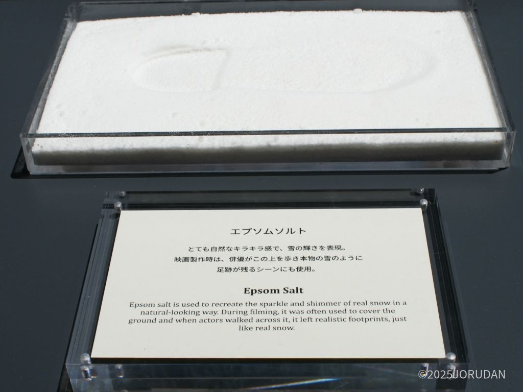 雪景色を作り出す技術を知るのもスタジオツアーの魅力のひとつ。雪素材には種類があり、雪を降らせる演出用のもの、水分を含んだ雪玉や雪だるまを作るための「ポリマースノー」(水を加えると膨らむ素材)、建物などに密着させるための「ペーパースノー」などが使い分けられています。こちらの展示も常駐したスタッフが丁寧に解説してくれますよ。
