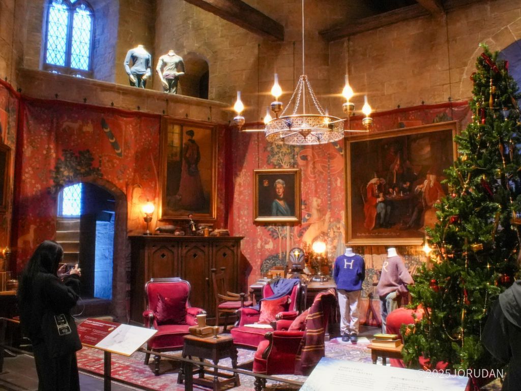 ハリーたちが学生生活を送った「グリフィンドールの談話室」と「男子寮」も、期間限定でクリスマス仕様となります。ツリーが飾られるほか、ロンの母の手編みのセーターを着たハリーとロンの姿も見受けられ (来場者からは、その温かそうなミット(手袋)にも注目が集まっていました)、『賢者の石』で描かれたクリスマスの朝のシーンを思わせる温かな空間が作られています。