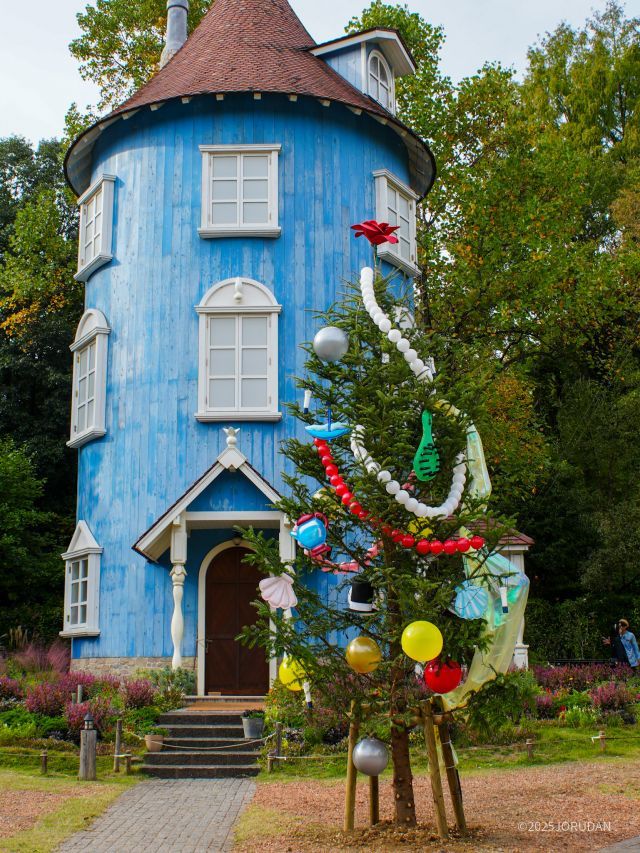 ムーミン屋敷の前に飾られたクリスマスツリーも物語の再現のひとつ。一般的なオーナメントではなく、物語に登場するバラの花や貝殻など「ムーミンたちが大切にしているもの」が飾られていて、原作ファンにはたまらない演出となっています。