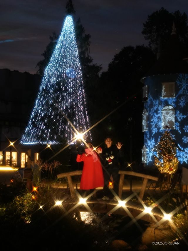 二人のカウントダウンでスイッチが押されると、ムーミン屋敷が温かな光でライトアップ。パーク内の木々に幻想的なオーロラのように輝く光が映し出され、一気にクリスマスの雰囲気に包まれました。