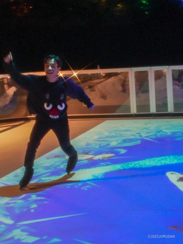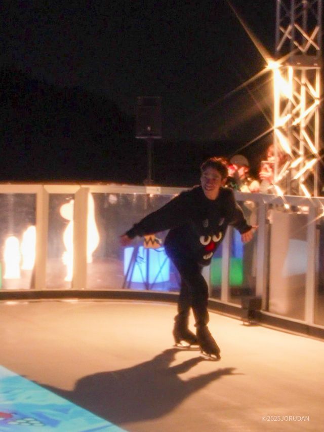 その映像と一体となるように、情熱的なデモスケーティングを披露。「(マッピングが)すごく可愛くて、スケートよりも映像を見ちゃうくらい。これを見に来るだけでも価値があります」と、昼とは全く異なるリンクの表情に感激した様子でした。