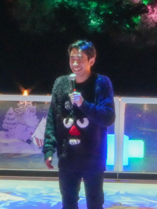 日が暮れるとムーミン谷のクリスマスNIGHT TIMEがスタート。点灯式には華やかなスケーティングを披露してくれた織田信成さんと、いたずらっぽい表情のリトルミイが登壇しました。