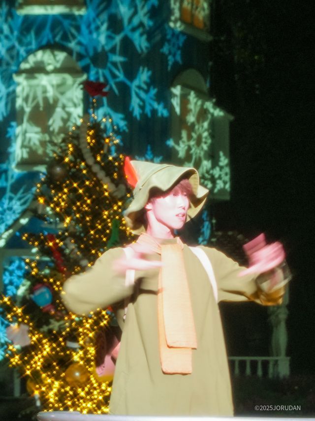 ムーミンたちが「クリスマスって何だろう?」と歌い踊る中、今回のショーで新登場となる「ご先祖さま」が観客と一緒にダンスレッスン。「ひざをとんとん、手を前に、クロス!」という振付や「ぐるぐる考えて、1、2、3!」というムーミンのダンスを会場全体で踊り、とても一体感が生まれました。