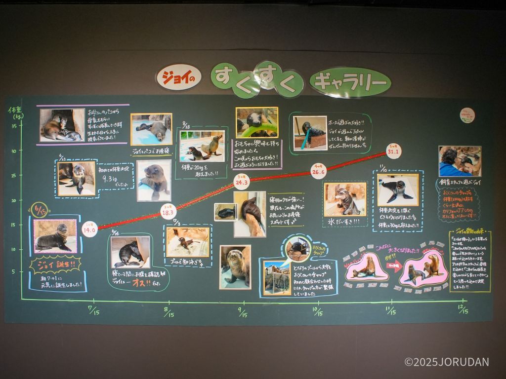 館内2階には「ジョイのすくすくギャラリー」が開設され、体重の増加グラフや初めてお父さんと対面した時のエピソードなど、飼育スタッフの手書きによる温かみのある展示でこれまでの成長の軌跡を振り返ることができます。