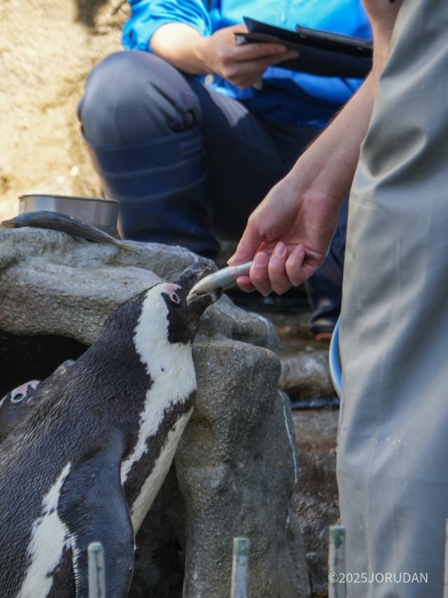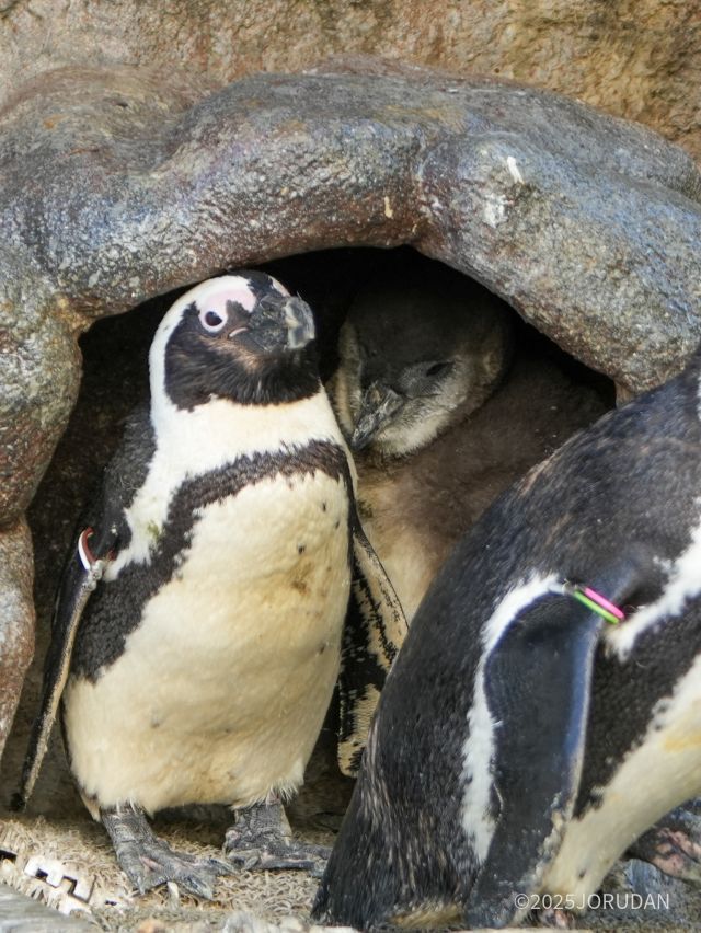 このエリアでは10月に誕生したばかりのケープペンギンの幼鳥も注目の的です。生後2日目には68gだった体重が現在は約3kgにまで増え、見た目の大きさは大人と変わらないほどに成長しています。まだ大人のような白黒模様ではなく、全体的にグレーっぽい「亜成鳥」特有の姿が見られるのはわずか3カ月ほどということです。