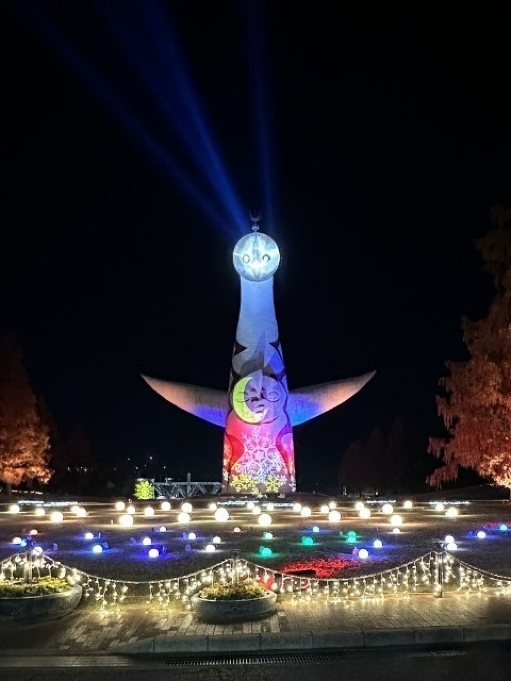 今年もコロナ以前の迫力あるプロジェクションマッピングは復活しておらず、残念です。太陽の塔前に色が変化するボール状の光り物がちりばめられ、太陽の塔に雪の結晶とか投影され、ちょっとだけ音楽とのコラボもありました。メインはラーメンエキスポ、ラーメン食べられて、ついでにイルミネーションも見られる、くらいに思って行くべきです。