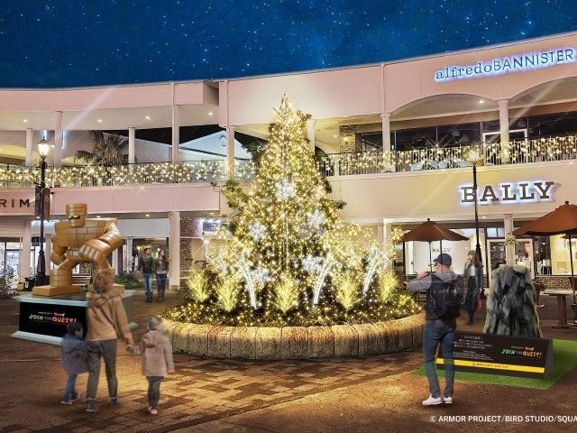 今年のウィンターイルミネーションは、スクウェア・エニックス「ドラゴンクエスト」オリジナル装飾に合わせて開催。期間中、場内各所に「スライム」や「ギガンテス」、「ゴーレム」など人気モンスターが、クリスマスツリーの装飾やパネル、オブジェになって登場し、施設全体をドラクエワールドに演出する。夜にはシャンパンゴールドのイルミネーションに照らされ、さらに賑やかで煌びやかな光の世界に。あたたかな光に包まれ非日常を感じるアウトレットで、「ドラゴンクエスト」の装飾と共に、ホリデーシーズンのショッピングを楽しむことができる。