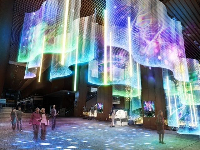 今年のテーマは「音楽で、世界が色づくクリスマス」。1階アトリウムから2階部分まで広がるダイナミックなイルミネーション「Music of Aurolights」では、まるで本物のオーロラが光り輝くようなイマーシブな空間を演出。これまでのツリーを主役とした装飾とは一味違い、光に包み込まれる新しいイルミネーションを実施する。また、2階貫通通路に設置された13音階のハンドベルで自由に奏でた音楽を、AIシステムが分析し「あなただけのカラー」となって空間全体に広がるインスタレーションを楽しむことができる。