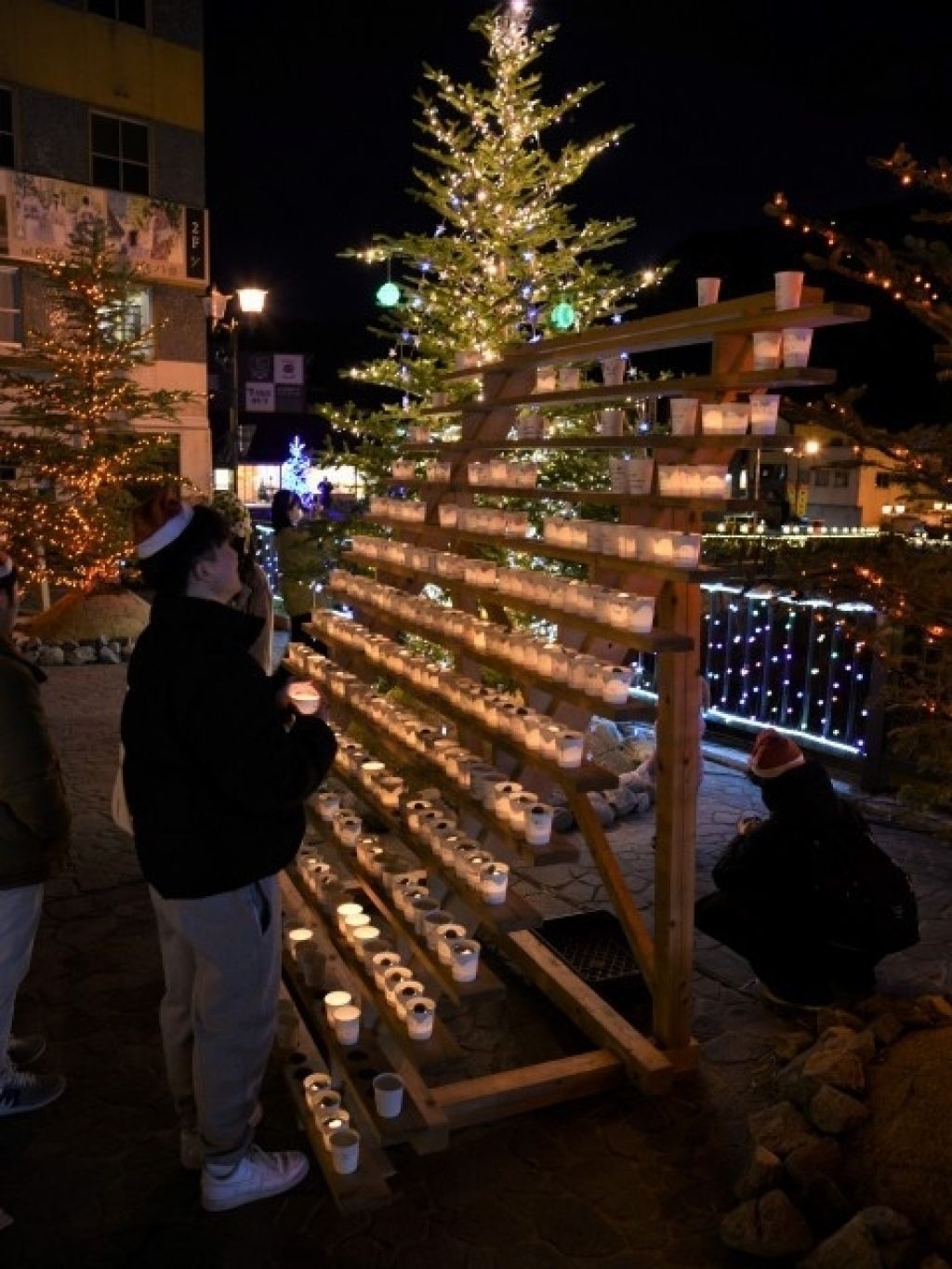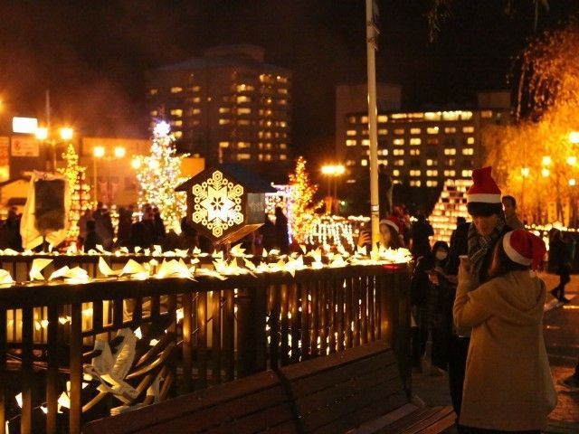 チャップリンのブロンズ像の周辺で世界平和の願いを込めて、約3000個のキャンドルの灯りが、クリスマスイブの夜のひとときを演出。下呂温泉花火ミュージカル冬公演クリスマス特別公演も同時開催予定。