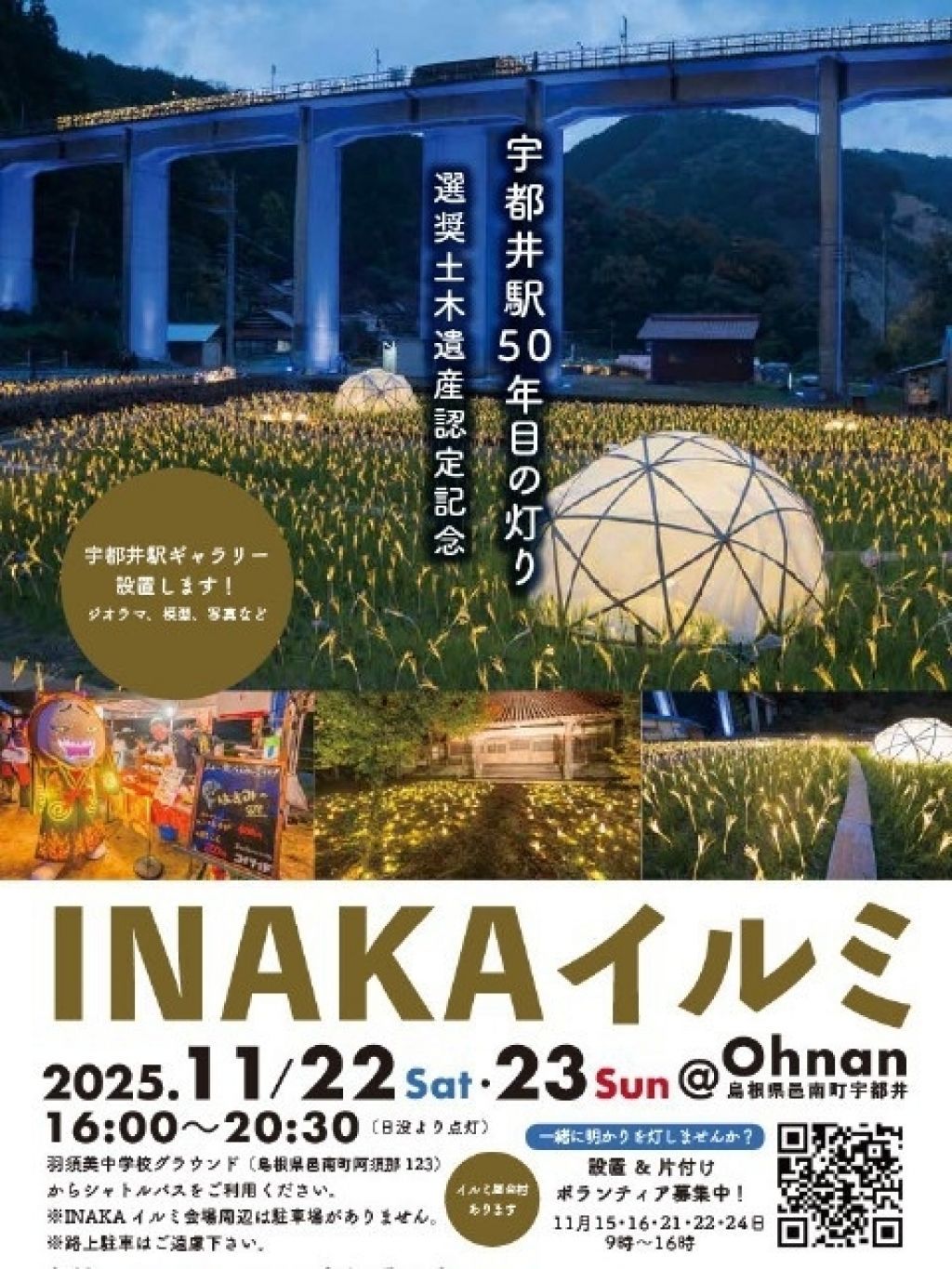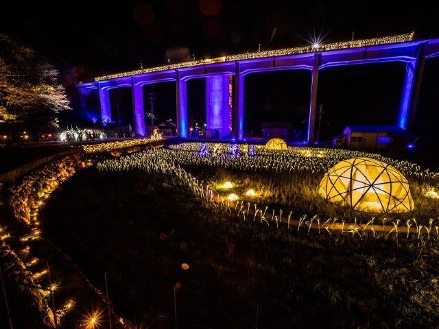 邑南町の農村の中で開催される自然の中のイルミネーションイベント。地上から20mの高さにある「天空の駅」旧JR三江線宇都井駅周辺と、谷あいの集落が田舎の魅力たっぷりに彩られる。今年は、三江線全線開通50周年の節目の年であり、宇都井駅が選奨土木遺産に認定された記念イベントを行う。