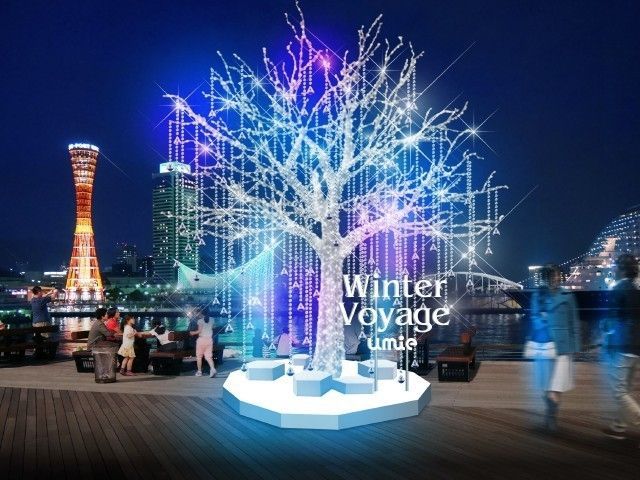 umieのイルミネーションはWinter Voyage(ウィンター・ヴォヤージュ)「冬の航海」がテーマ。海の煌めき、オーシャンブルーに輝く7mのツリーが登場。パステルカラーの海のバブルがはじけて、見る人を「夢の船旅」へと誘う。モザイクのイルミネーション、Winter Voyage「冬の航海」では、美しいオーロラや氷山を発見したり、クリスタルのような輝きを放つ樹氷を眺めたり・・・。神戸の夜景をバックにした幻想的なイルミネーションに出会う旅へ、いざ、出航!