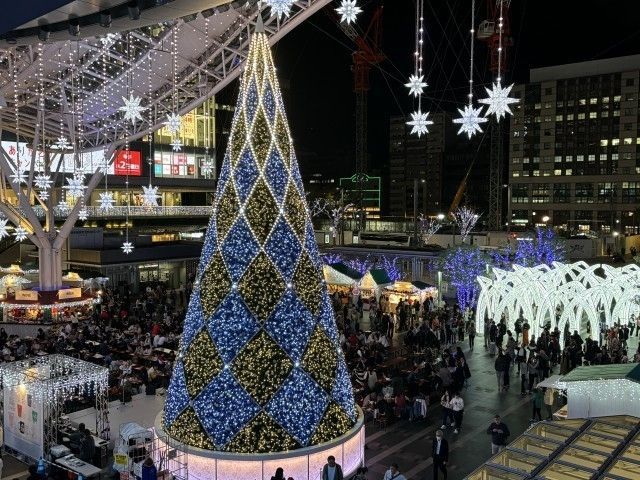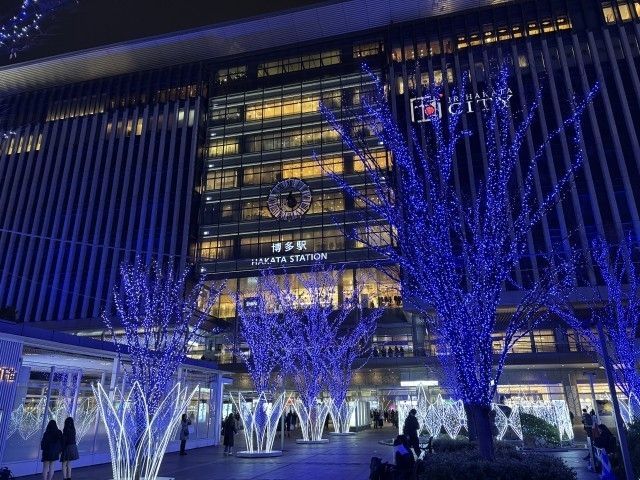 JR博多シティとキャナルシティ博多、博多駅周辺の街路樹イルミネーションが一体となり、博多の夜が約150万球を超えるLEDで輝く。JR博多シティでは大屋根に灯る星空のイルミネーションやツリー、光の花束など様々な光が駅前の街をきらびやかに彩る。また、キャナルシティ博多では、長さ180mの運河や半球体のサンプラザ壁面をライトアップ。ユニークで壮大な空間を光で包み込む。