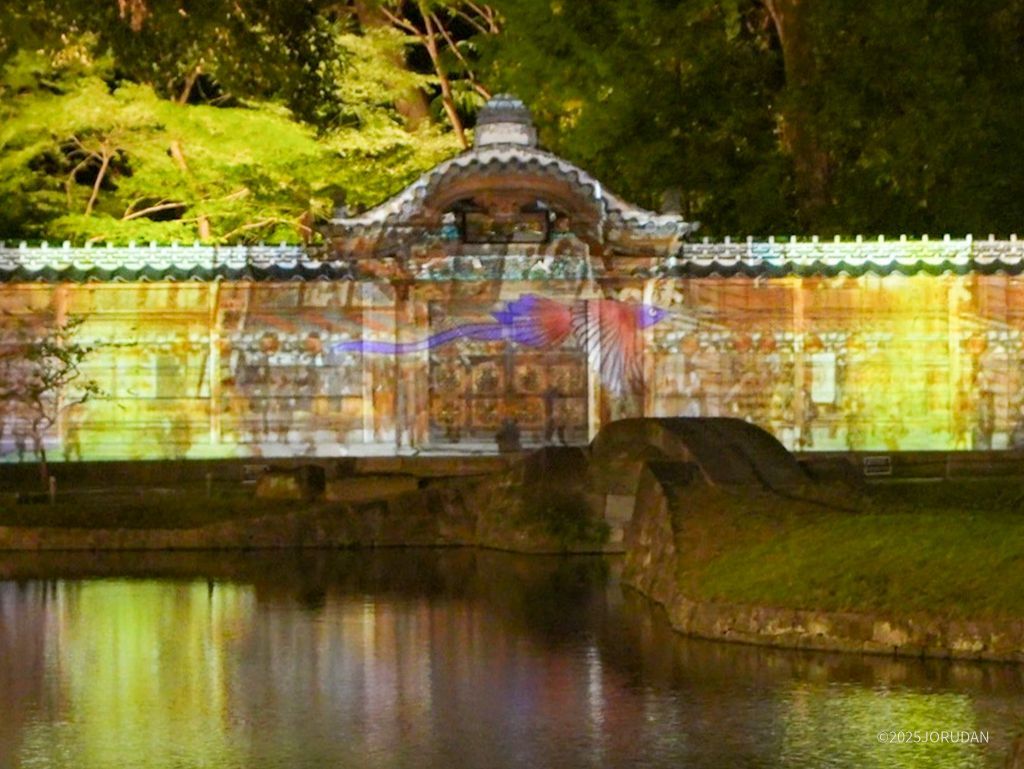 そしてイベントの目玉は、庭園とお屋敷を隔てていた「唐門」をスクリーンにしたプロジェクションマッピングです。戦災で焼失後2020年に復元されたこの門は、かつて高貴な身分の者しか通れなかった特別な場所。そんな唐門で行われるプロジェクションマッピングは水戸藩時代の江戸の暮らしや風景を写し取った泥絵や浮世絵の世界を映し出します。例えば唐門から飛び立った折り鶴が、色鮮やかな世界を旅するような───浮世絵の物語が壮大な音楽と共に映し出され、江戸時代に思いを馳せるような特別な体験を楽しめます。