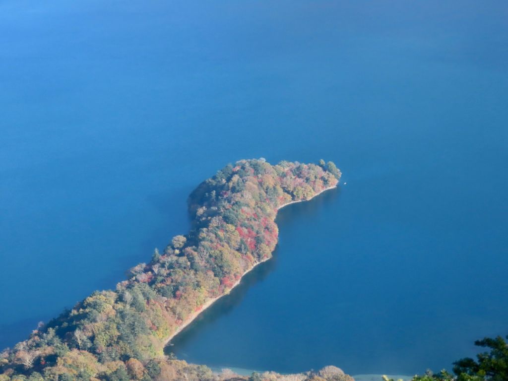 - 半月山駐車場から20分ほどかけて山を登り、半月山展望台へ。そこから見下ろした先に紅葉の名所八丁出島がある。霧が流れていたのが残念だったが。