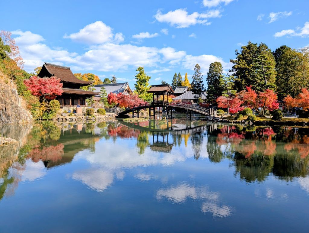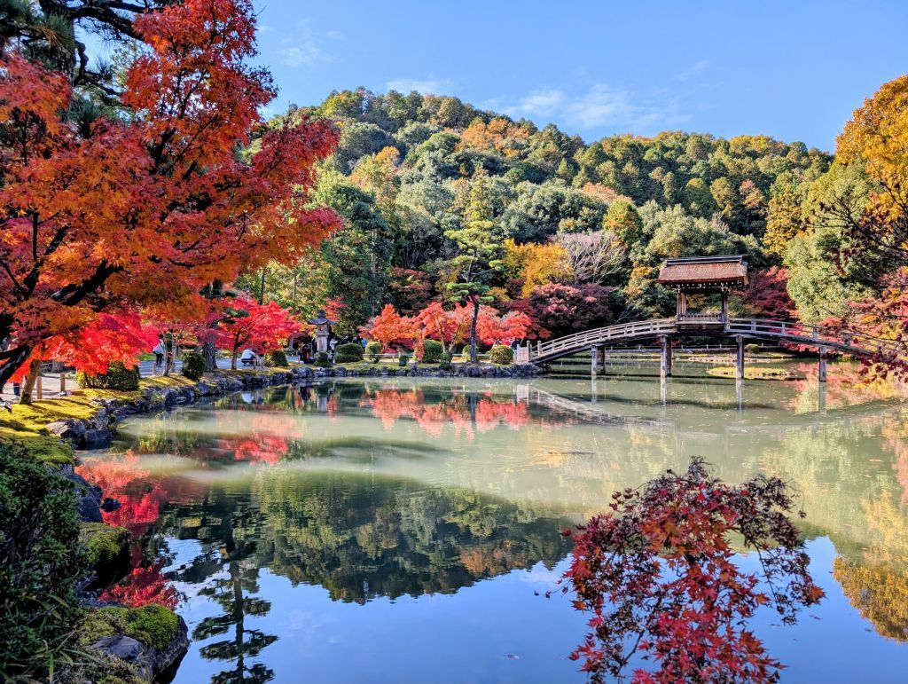 心の字池に映えるもみじの向こうの国宝観音堂は絶景です