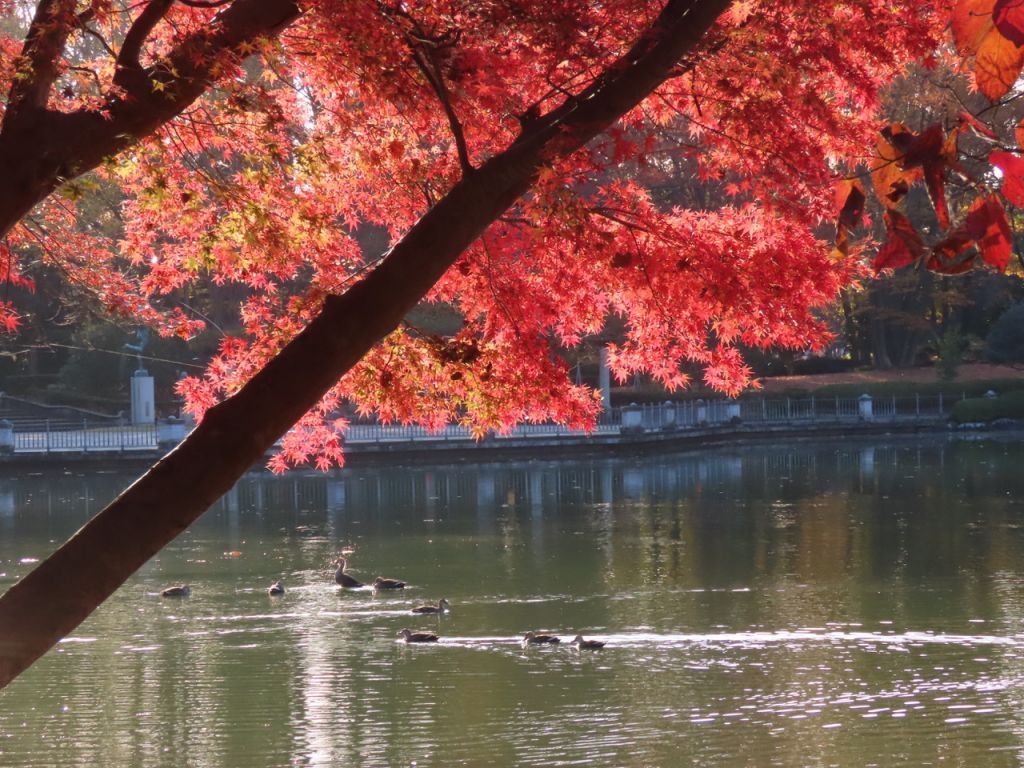 - 昭和大池にはカルガモやオシドリも。池の辺りのカエデの木が真っ赤に燃えていた。