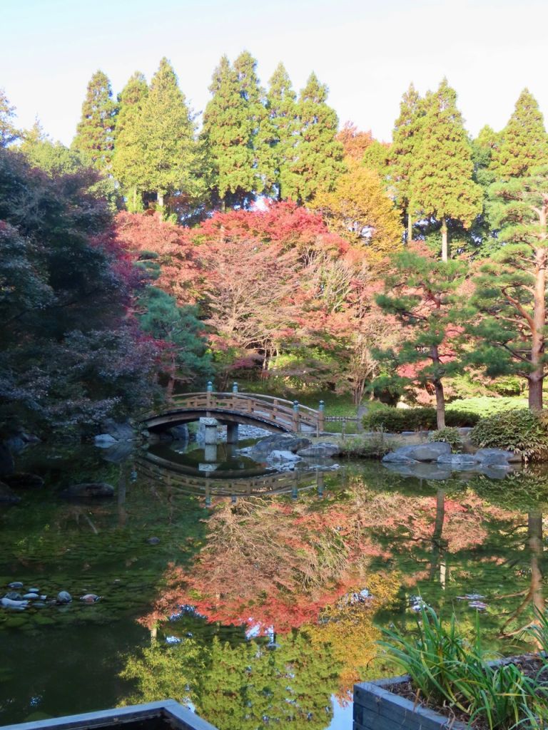 - 日本庭園に架かる太鼓橋の池が鏡面になっていて、紅葉の木々が上下に映る。