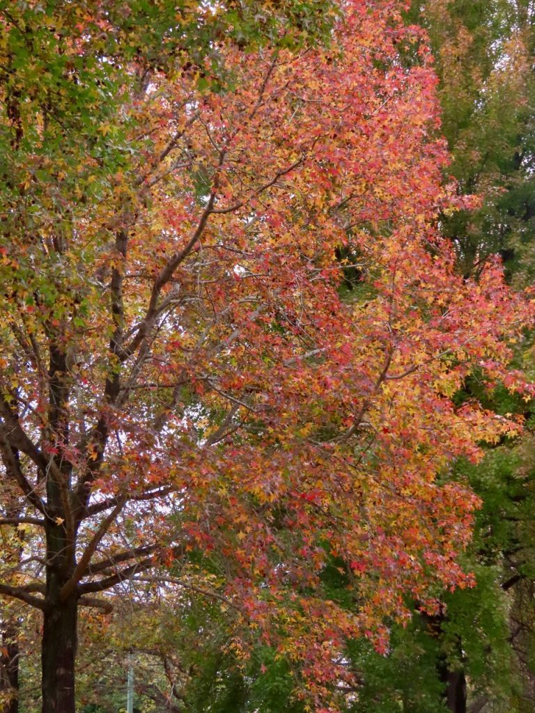 - 広大な都市型公園のわんぱく公園には、何ヶ所もの駐車場がある。その1ヶ所にモミジバフウの並木がある。大きな葉っぱが、赤やオレンジや黄色に染まった光景はかなり見応えがある。
