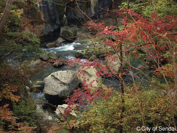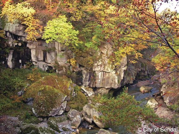 秋保温泉街の入口にある「覗橋」を中心に、上下約1㎞の長さにわたり、深さ20mにも達する。また渓谷沿いには約700mの遊歩道もあり、「八間巌」「鳴合底」「鬼面巌」などの奇勝や「時雨滝」「三筋滝」などの渓谷美を堪能できる。「磊々」とは奇岩が連なる様子を表す言葉。