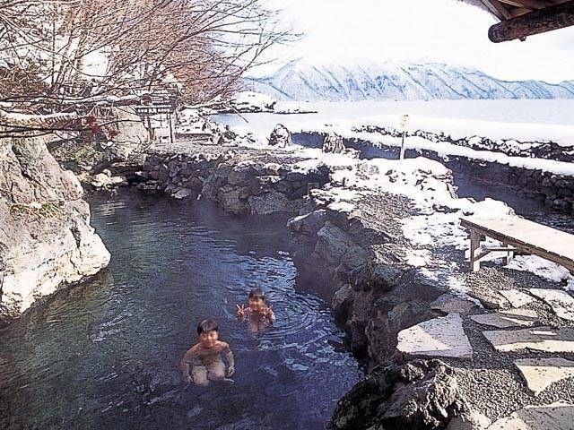湖とつながる水門から流れ出る湯量により温度を調節する、野趣に富んだ天然露天風呂と、湖を一望する展望露天風呂の2種類の露天風呂が楽しめる。いかにも秘湯というロケーションだ。
