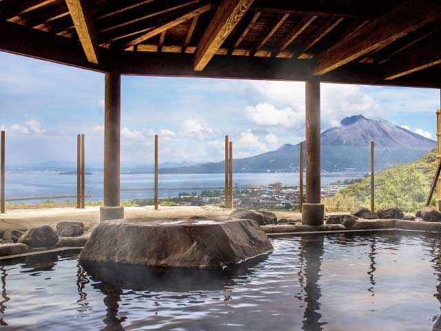 男女別の内風呂と露天風呂はすべて源泉かけ流し。錦江湾や開聞岳を望む露天風呂は、特に夕景が素晴らしい。