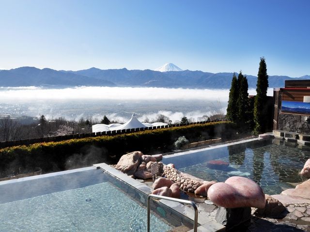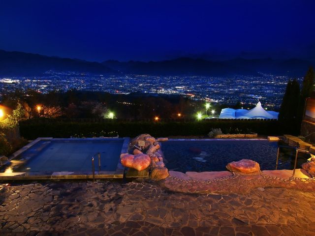 山梨が誇る「温泉」と「フルーツ」を融合させた新しいジャンルの日帰り温泉。露天風呂には宝石風呂や薬石「麦飯石」風呂などがあり、富士山や新日本三大夜景に認定された「笛吹川フルーツ公園」を眺めながらの入浴が人気。