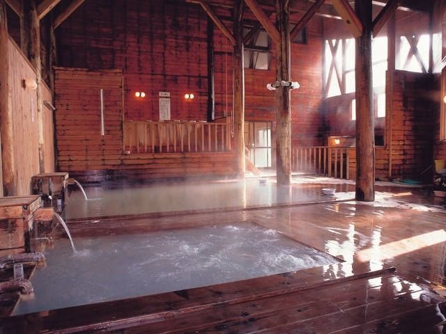 硫黄成分をたっぷり含んだ泉質で、昔ながらの湯治場の風情が漂う。宿の名物は箱蒸しや打たせ湯、火山風呂など7種類の湯が楽しめる大浴場。木の風合が温泉場の歴史を物語っている。